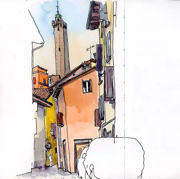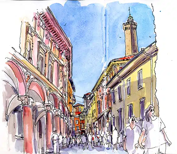 Vous rapporterez de votre séjour à Bologne des pages richement colorées, où perspectives urbaines et scènes de vie généreuses se disputeront la meilleure place.