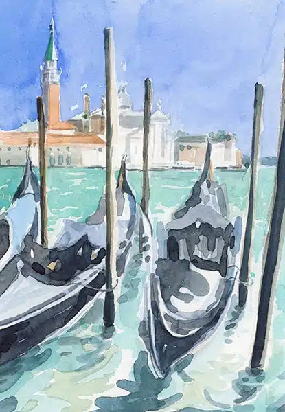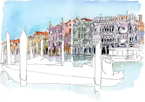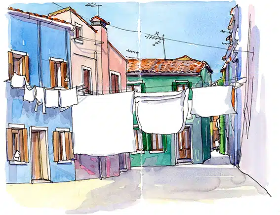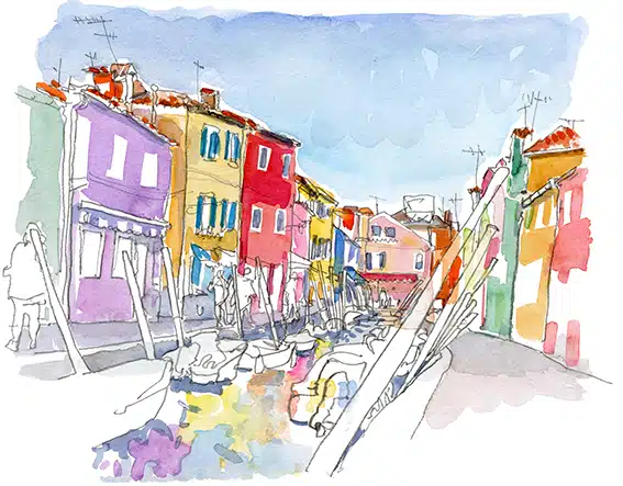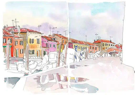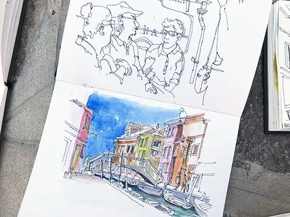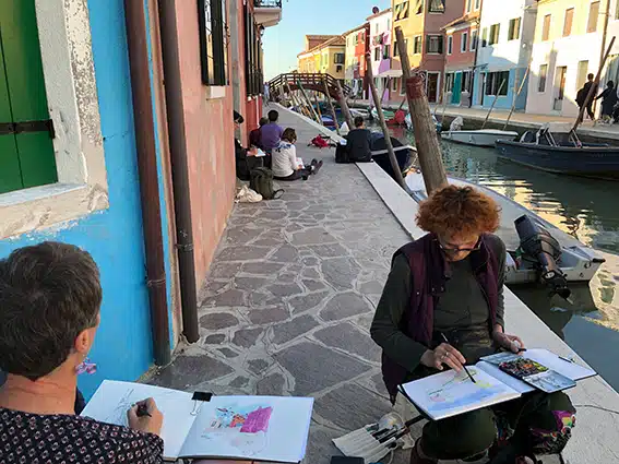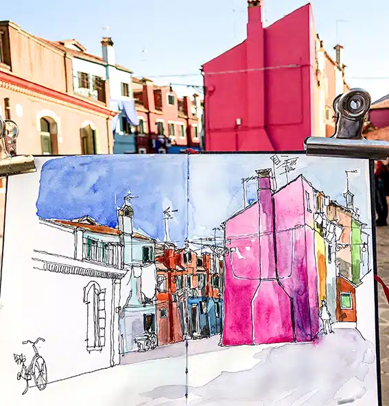 Deux îles, mille éclats. Entre les façades éclatantes de Burano et les verreries chatoyantes de Murano, l’eau de la lagune devient un miroir vibrant. Ici, chaque instant change la lumière, chaque reflet raconte une histoire. Croquez sur le vif, laissez l’aquarelle capturer l’éclat des couleurs, la douceur des ombres et la magie des miroitements. Repartez avec un carnet qui respire Venise, lumineux, inoubliable.