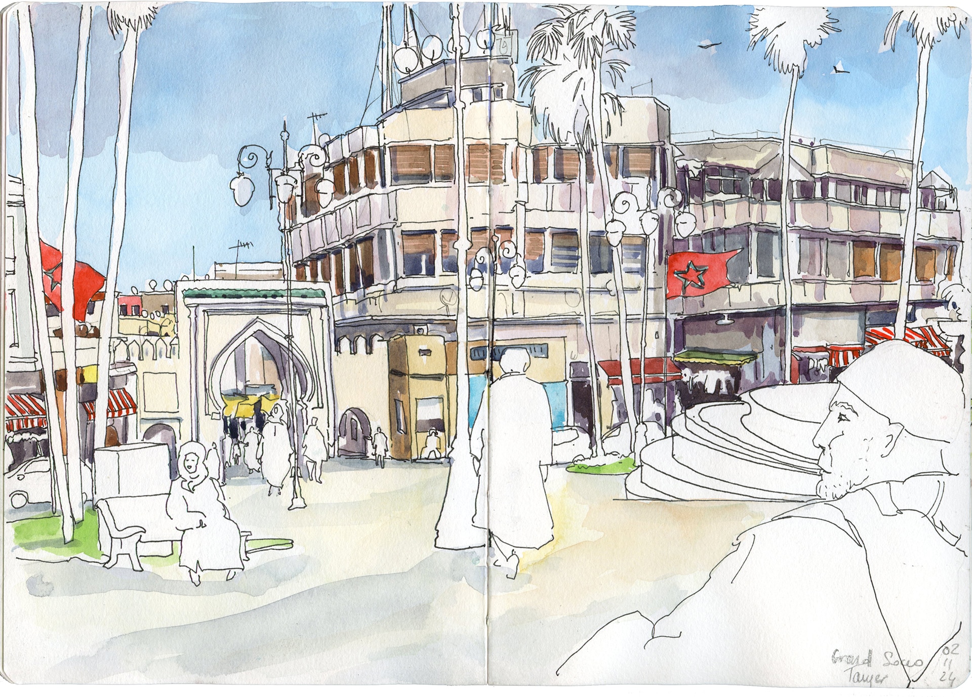 Entre les bleus de la mer, les ocres des murs, les ruelles de la médina, le bazar du souk, les cafés à l’ombre des palmiers, le cap Spartel et la lumière incomparable du détroit de Gibraltar, chaque coin de rue ou de paysage est une scène à dessiner. C’est un lieu idéal pour dessiner un carnet de voyage vivant, coloré et sensible en suivant les traces de Matisse, Delacroix ou Tennessee Williams.